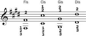 - von den Alterationen (Tonhöhenänderungen, die durch Vorzeichen angezeit